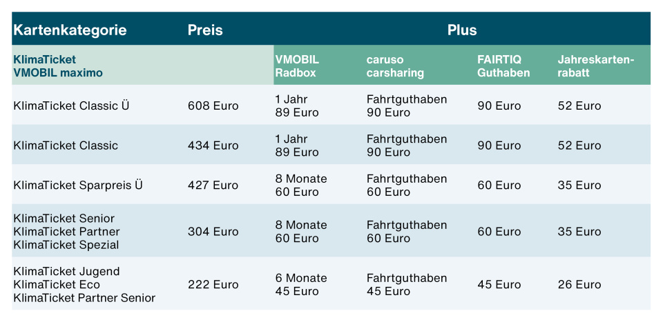 *gültig beim Kauf eines Klimaticket VMOBIL Classic. Je nach Kartenkategorie ändert sich die Höhe des Plus.