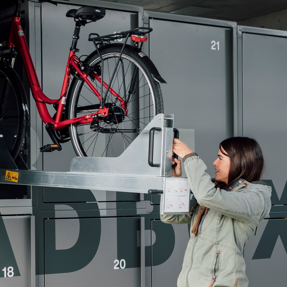 - Die Boxen im oberen Geschoss sind mit einer Einstellschiene versehen, die das komfortable Hochheben des Fahrrads ermöglicht. Die unteren Boxen verfügen über eine Einstellschiene in V-Form zum einfachen Verstauen des Fahrrads. Einfach das Fahrrad einstellen, die Türe zudrücken und mit Bahn oder Bus weiterfahren.