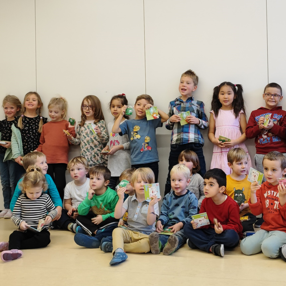 Sehr zur Freude des zuständigen Geschäftsführers beim Stadtbus Feldkirch, Siegfried Burtscher, der sich bei den Kindern und den Pädagog:innen persönlich herzlich bedankte: „Das 409er Buslied hat mich tatsächlich berührt und die Freude der Kinder über die neue Bushaltestelle vor der Haustüre des Kindergartens war deutlich zu hören und zu spüren.“ Als kleines Dankeschön überreichte Siegfried Burtscher den Kindern jeweils ein Pixie Buch „Hannah lacht, so wird gutes Klima gemacht“.