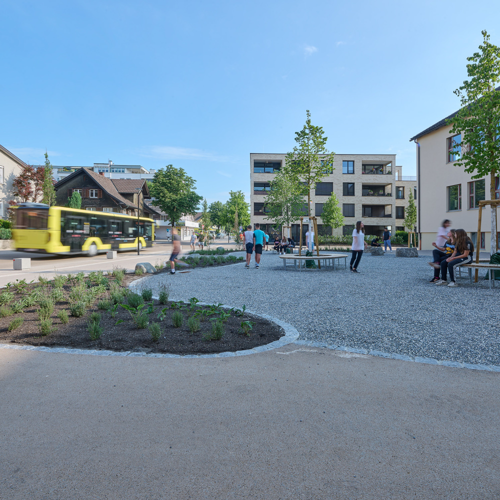 Vor der Mittelschule Kirchdorf wurde die Straße zur verkehrsberuhigten Begegnungszone umgestaltet. Damit ist sie die dritte Schule in Lustenau mit einer 20-km/h-Zone.