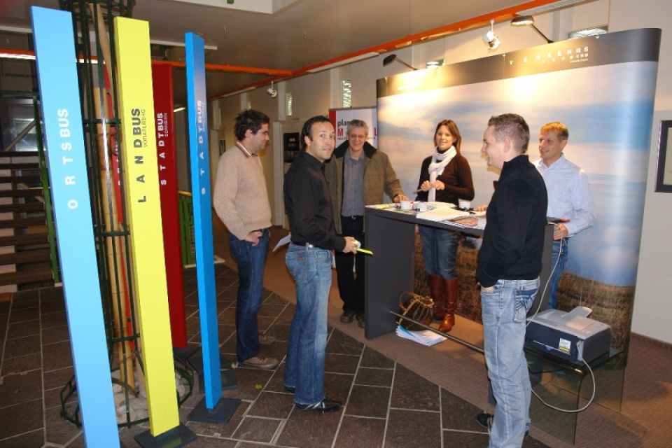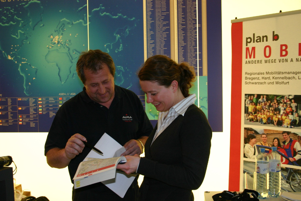 Am 24. April 2008 konnten sich die MitarbeiterInnen der Firma "Alpa" in Hard über optimale Mobilität konkret für sich informieren. Und das ganz bequem am Arbeitsplatz. VertreterInnen des Verkehrsverbund, der Wirtschaftskammer und der Gemeinde Hard zeigten Alternativen zum eigenen Auto auf. Für die MitarbeiterInnen von Alpla gab es einen persönlichen Fahrplan und kompetente Beratung zu Tarifen und Fahrplänen.