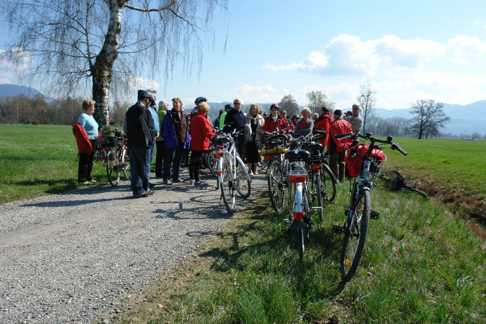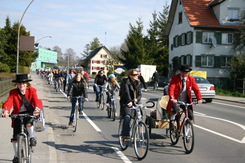 Sonntagvormittag und schon alles auf den Rädern: Zahlreiche TeilnehmerInnen radelten in einer Sternfahrt aus allen plan-b Gemeinden nach Lauterach in den heurigen Radfrühling. Auch Bürgermeister und Gemeindevertreter traten gerne in die Pedale. In Lauterach nahm Bürgermeister Elmar Rhomberg die Festgäste in Empfang – auf zwei Rädern versteht sich. Für musikalischen Rückenwind sorgten Musikanten aus Bregenz und den Hofsteiggemeinden gemeinsam.