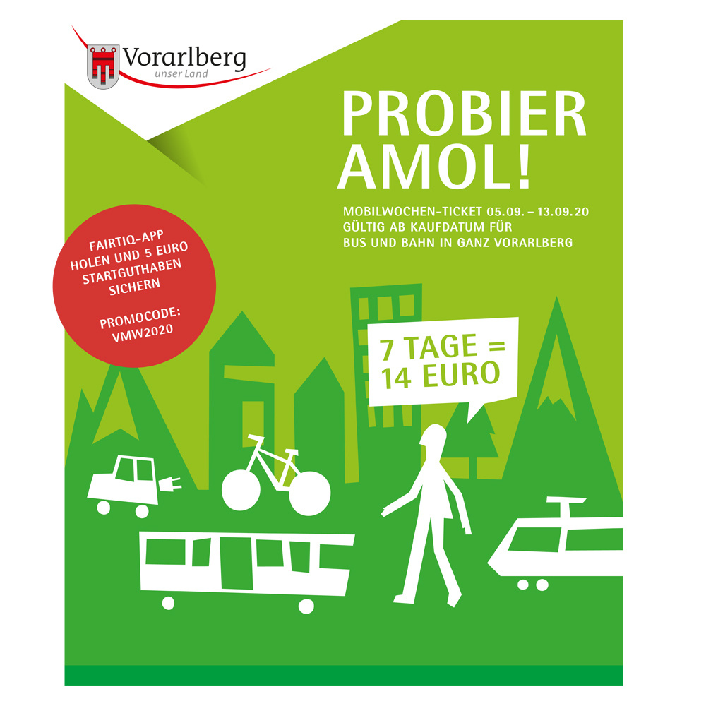 Probier amol: Für nur 14 Euro 7 Tage mit Bus und Bahn im Ländle unterwegs sein, 5 Euro Startguthaben für FAIRTIQ holen, CARUSO Carsharing testen, tolle Wanderungen unternehmen oder beim MOBILWochen-Gewinnspiel tolle Preise gewinnen. Das und mehr gibt es in der Vorarlberg MOBILWoche von Samstag, 5. bis Sonntag, 13. September 2020.