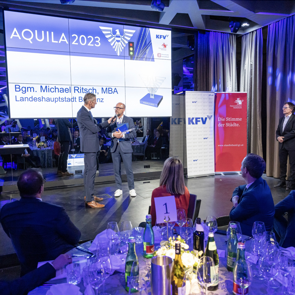 Alle zwei Jahre prämieren das Kuratorium für Verkehrssicherheit, der Österreichische Gemeindebund und – heuer zum ersten Mal als Partner – der Österreichische Städtebund engagierte Verkehrssicherheitsprojekte mit der AQUILA-Auszeichnung. Dieses Jahr wurde der Landeshauptstadt Bregenz am 12. Oktober 2023 für den Ausbau der überregionalen Radschnellverbindung am Bodenseeufer der Sonderpreis „Best Practice zur Förderung von Sicherheit im Radverkehr“ verliehen.