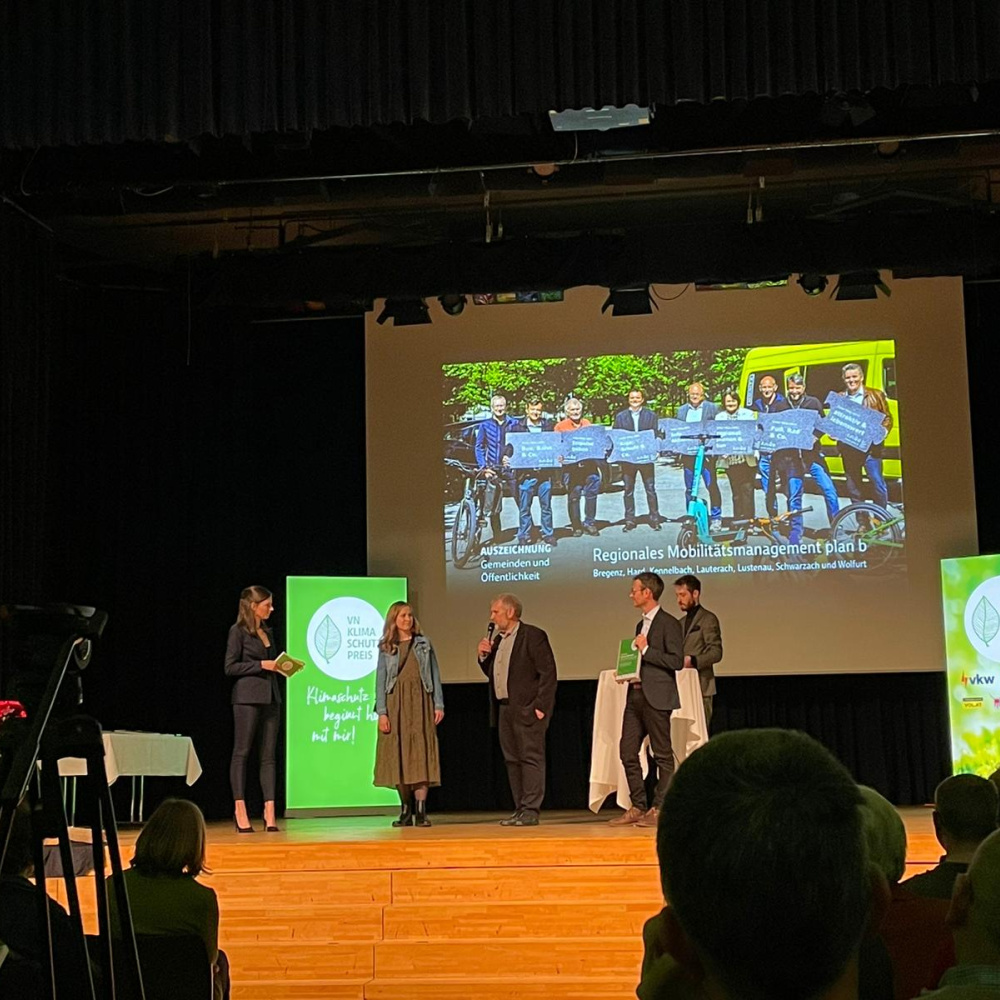 Gemeinsam besser unterwegs – das ist seit 2004 Überzeugung und Leitschiene der sieben plan b-Gemeinden. Infrastruktur, Angebote, Förderungen, Impulse und vieles mehr werden in der Region abgestimmt, gezielt umgesetzt und weiterentwickelt. Das Land Vorarlberg und die „Vorarlberger Nachrichten“ haben die Gemeindekooperation plan b dafür mit dem VN-Klimaschutzpreis 2022 in der Kategorie „Gemeinde und Öffentlichkeit“ ausgezeichnet. Vertreter:innen der plan b-Gemeinden nahmen den Preis am 24. November 2022 im J.J. Ender-Saal in Mäder entgegen. Die Freude über die Auszeichnung ist groß: „Es ist schön zu sehen, dass unsere gemeinsame Arbeit wirkt - immer mehr Menschen in der plan b-Region sind nachhaltig unterwegs. Umso schöner, wenn man dafür auch noch eine wertschätzende Auszeichnung erhält“, sind sich die Vertreter:innen der plan b-Gemeinden einig.