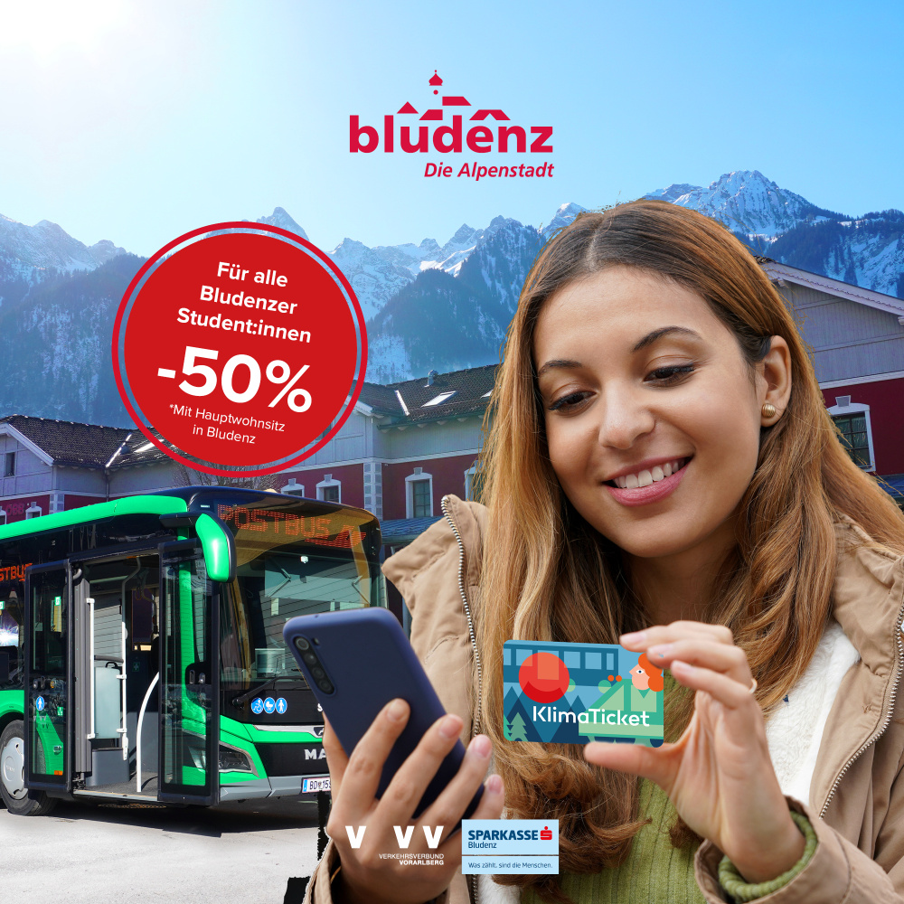 Mit dem neuen „Klimaticket Ö“ ist es möglich, ein Jahr alle „Öffis“ (öffentlicher und privater Schienenverkehr, Stadtverkehre und Verkehrsverbünde) in ganz Österreich zu nützen. Bis zum vollendeten 26. Lebensjahr kostet ein österreichweit gültiges Ticket 821 Euro. Alle Studierenden von 18 bis 26 Jahren, die ihren Hauptwohnsitz in Bludenz gemeldet haben, können sich das Klimaticket Ö Jugend vor Ort beim Mobilpunkt Bludenz zum halben Preis sichern.